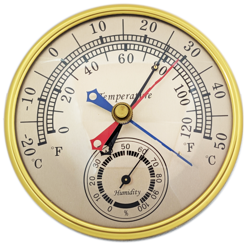 SKU DIALWTH2 Temperature Range -20°C to 50°C / -4°F to 122°F Accuracy ±2°C (±3.6°F) Humidity Range 0% to 100% RH Display Three-hand analog with 5 mm high numerals Finish Brass-tone frame and dial Cover Clear plastic dome Knobs Metallic, knurled, center-mounted (reset min/max) Diameter 130 mm (5.12 inches) Height/Depth 52 mm (2.05 inches) Weight 90 g (3.17 oz) Mounting Rear keyhole slot for wall mounting Power Mechanical – no batteries required (bimetallic strip)