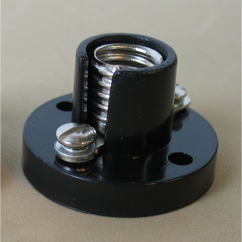 Miniature light bulb base for science projects and electronic ideas. This lamp holder is available in black color and holds our 1.2-volt, 2.25-volt, and 5.1-volt light bulbs. It features a rolled shell of nickel-plated brass mounted on a base with two screw terminals and two pre-drilled holes to mount to a project board. The base diameter is 30mm and the height is 18mm.